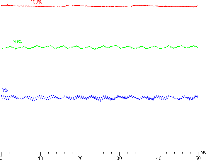 На любом уровне яркости значимая модуляция подсветки отсутствует, поэтому нет и никакого мерцания экрана. Для тех, кто привык распознавать знакомое сокращение, уточним: ШИМ отсутствует. В доказательство приведем графики зависимости яркости (вертикальная ось) от времени (горизонтальная ось) при различных значениях настройки Подсветка: