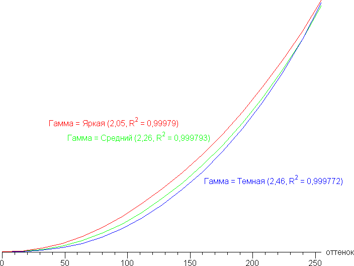 Для оценки характера роста яркости на шкале серого мы измерили яркость 17 оттенков серого при различных значениях параметра Гамма. На графике ниже приведены полученные гамма-кривые (значения показателей аппроксимирующей функции приведены в скобках в подписях, там же — коэффициент детерминации):