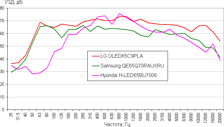 Громкость встроенной акустической системы для жилой комнаты, соответствующей по размерам данной диагонали экрана, достаточная, но запаса нет совсем. Стереофонический эффект выражен хорошо. Присутствуют высокие и средние частоты, низких — немного. Явно есть паразитные резонансы корпуса, но даже на максимальной громкости нет значительных искажений сигналов с высоким уровнем. В целом для класса встроенной в телевизор акустики ее качество приемлемое. Сравним АЧХ этого ТВ с АЧХ двух телевизоров высшего класса (получена с помощью шумомера при воспроизведении звукового файла с розовым шумом, интервал УЗД в 1/3 октавах):