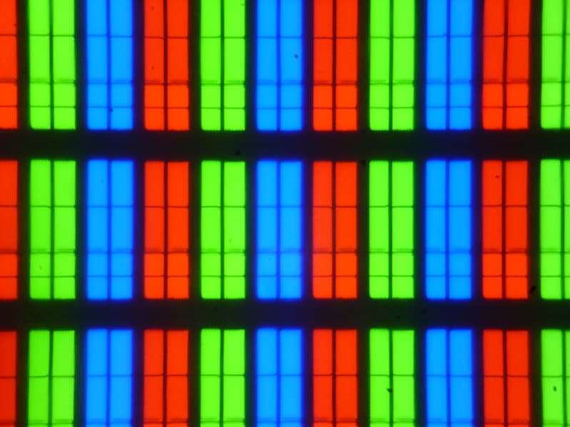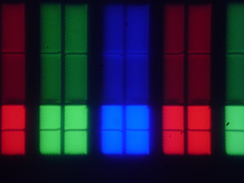 Субпиксели трех цветов (красного, зеленого и синего) поделены на две различающиеся по площади и независимо управляемые области, каждая из которых разделена на четыре участка с доменами в различающейся ориентации. Такое сложное устройство в принципе способно обеспечить широкий динамический диапазон по количеству оттенков, так как с ростом яркости области включаются последовательно, и хорошие углы обзора, чему способствует вариация ориентации ЖК в доменах (фотографии с большим увеличением):
