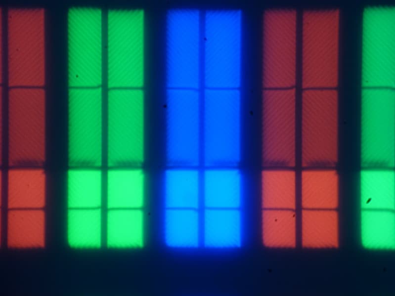 Цвета на экране имеют естественную насыщенность, так как большинство изображений предполагают просмотр на устройствах с охватом sRGB. Ниже приведен спектр для белого поля (белая линия), наложенный на спектры красного, зеленого и синего полей (линии соответствующих цветов):