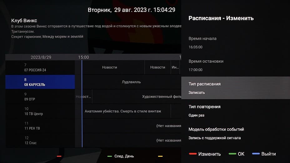 Присутствуют четыре списка избранных программ. Есть хорошая поддержка электронной программы передач — можно посмотреть, что именно идет или будет идти на текущем и других каналах, запрограммировать просмотр или запись программы или сериала и т. д.