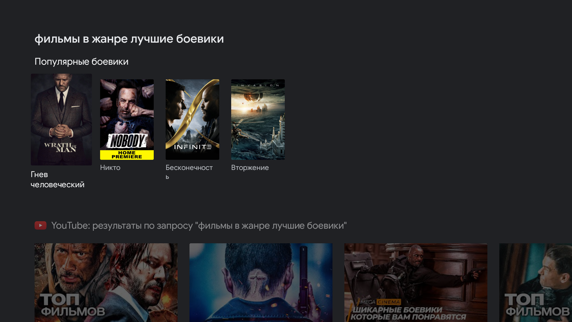 В ряде программ работает голосовой ввод текста. Также есть базовая интеграция с самим ТВ, например, голосом можно менять громкость, выключать/включать звук, открывать меню с настройками, выбирать нужный вход и запускать программу по ее названию. Еще можно вывести на экран программу телепередач и переключиться на ТВ-канал по его названию. На слова и фразы, не распознанные как команды, выполняется поиск, и в результатах поиска будет предложен развлекательный контент, в том числе из YouTube, а иногда открывается страница приложения в магазине Google Play с названием, соответствующим поисковой фразе.