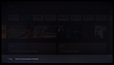 Голосовой помощник от Google запускается при нажатии на кнопку с цветным микрофоном (для ввода голосовой команды держать ее не нужно, а при включенном микрофоне на пульте горит красный индикатор), также его можно запустить с домашней страницы или нажатием на мультимедийную кнопку поиска на цифровой клавиатуре. Этот помощник поможет найти контент, который предоставляют ряд программ, и ответить на какие-то вопросы (показывает и проговаривает ответ), например, какая сейчас погода за окном. Пульт желательно держать поближе к себе, поскольку встроенный в пульт ДУ микрофон не является высокочувствительным.