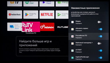 В телевизоре предустановлено достаточное количество приложений, часть из которых растеряла свою актуальность на территории РФ. Но уже хорошо известное нам приложение RuTV Link в котором можно быстро найти всё необходимое российское ПО (браузер Яндекс, различные стриминговые сервисы и онлайн-кинотеатры). Список приложений постоянно пополняется — обновления выходят часто.