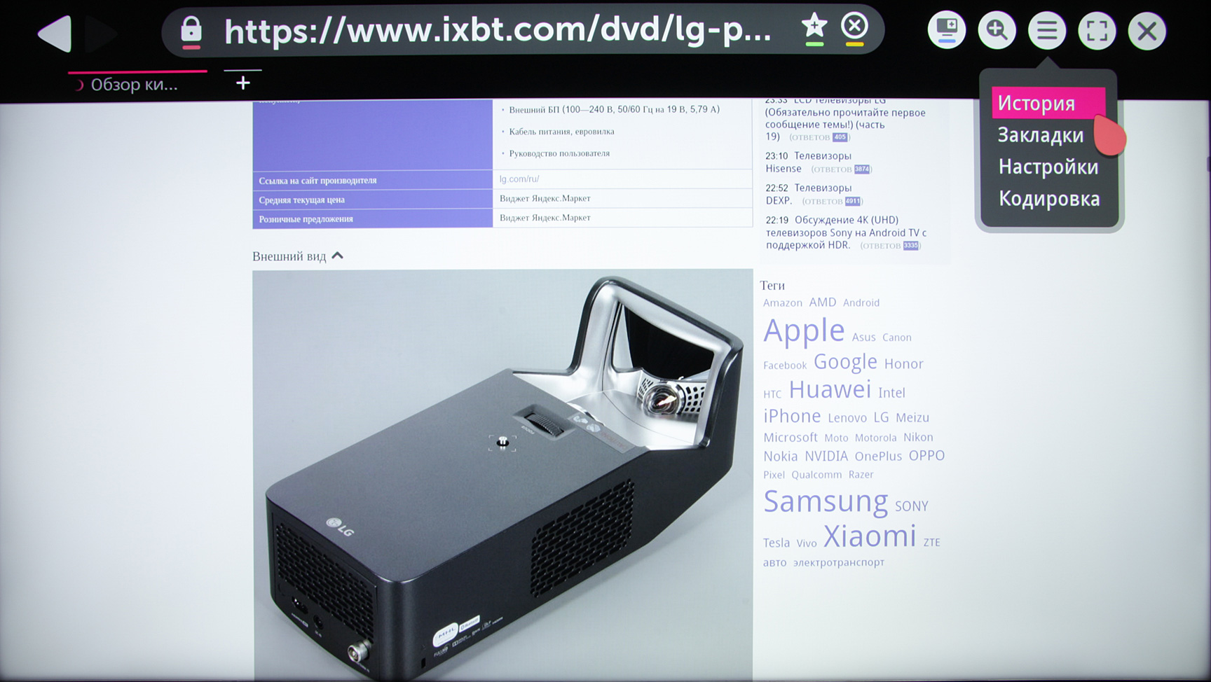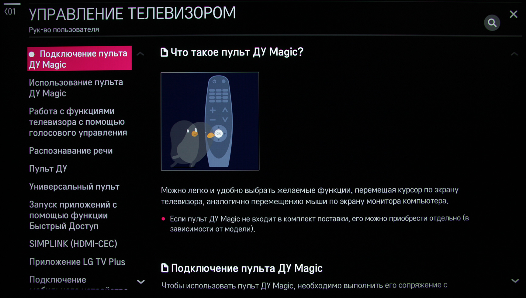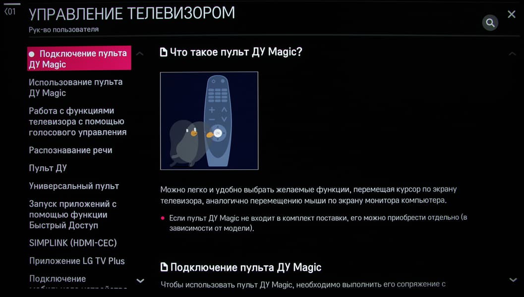 Пульт имеет функцию координатного ввода — курсор на экране перемещается наклоном пульта вверх-вниз и поворотом вправо-влево. Курсор появляется на экране после прокрутки колесика и исчезает после нескольких секунд малоподвижного состояния пульта. Курсор при движении не выходит за края экрана, что позволяет легко калибровать координатный ввод под удобный хват пульта. Также к телевизору можно подключить клавиатуру и мышь, но только по USB. Вернее, подключение по Bluetooth поддерживается только для каких-то избранных клавиатур LG. Эти устройства ввода, как и любая опробованная нами USB-периферия работают через USB-разветвитель, освобождая дефицитные USB-порты под другие задачи. С проводными и беспроводными клавиатурами и мышами от разных производителей не возникло никаких проблем. Поддерживается прокрутка колесиком, а задержка перемещения курсора мыши относительно движения самой мышью минимальная. Для подключенной клавиатуры можно выбрать альтернативную раскладку, в том числе и кириллическую самого распространенного варианта, при этом поддерживается смена раскладки клавиатуры (сочетанием клавиш Ctrl и пробел) на основную (английскую) и обратно на выбранную. Некоторые клавиши клавиатуры из основного и дополнительного мультимедийного набора напрямую вызывают ряд функций телевизора. Заявлена поддержка игровых контроллеров при подключении по USB. Нужно отметить, что в целом интерфейс хорошо оптимизирован для использования только кнопок пульта ДУ, то есть пользоваться мышью пульта или подключать клавиатуру и мышь, в общем-то, не обязательно.