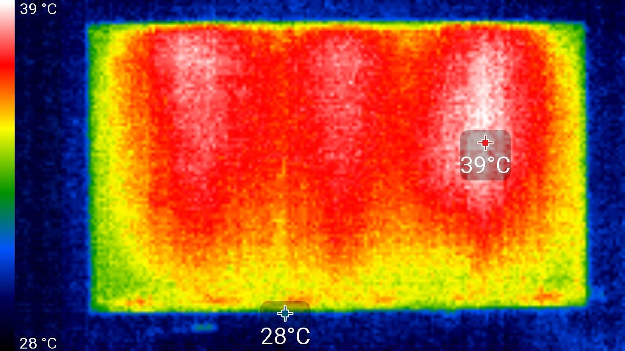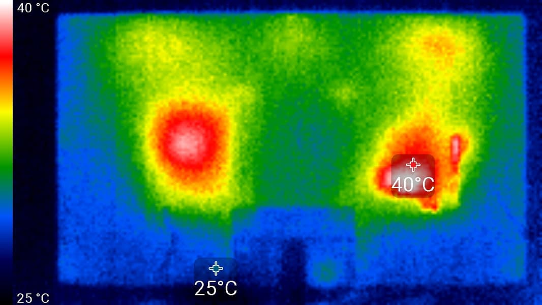 Нагрев телевизора можно оценить по приведенным снимкам с ИК-камеры, полученным после долговременной работы на максимальной яркости в помещении с температурой примерно 24 °C: