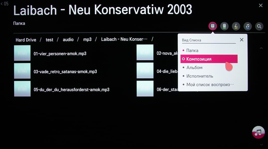 Есть функция поиска, но по тэгам она не ищет (ну вот как так?!), хотя они отображаются в списке с сортировкой по тэгам. Поэтому в результатах поиска будет все та же выдача контента потоковых сервисов, а не локальное содержимое. Работа со списками и собственно плеер выглядят как два независимых приложения (и, скорее всего, ими и являются). Экран ТВ можно отключить на время воспроизведения аудиофайлов.