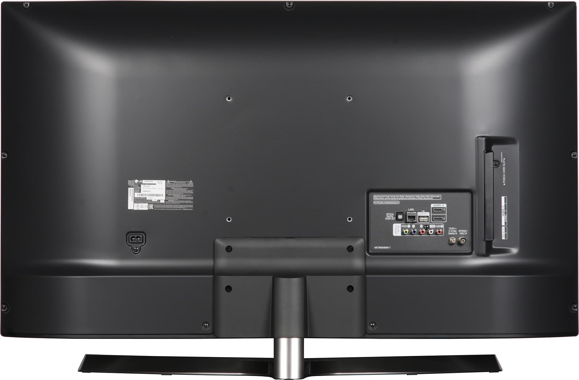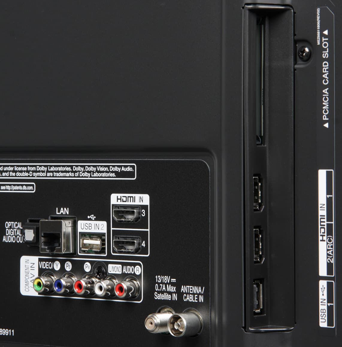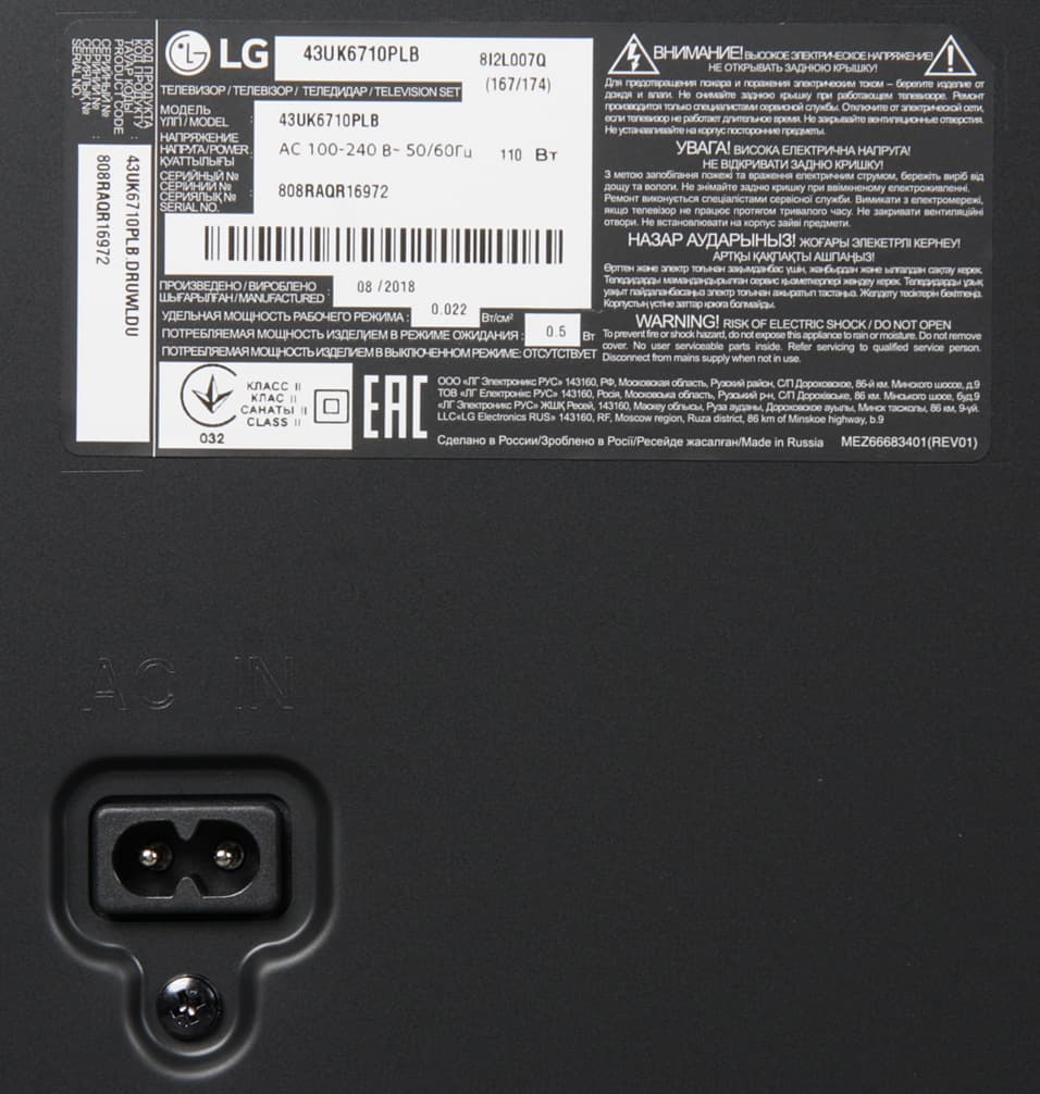 Большинство разъемов направлено назад, что затрудняет к ним доступ при настенном размещении телевизора. Хорошо хоть то, что комплектный кабель питания оснащен компактным Г-образным разъемом со стороны подключения к телевизору и Г-образной вилкой.