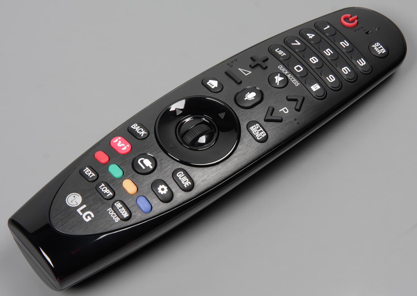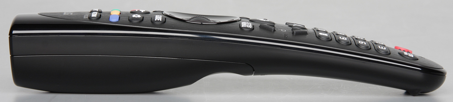 К телевизору прилагается пульт серии Magic (модель AN-MR18BA), хотя на коробке и написано, что его нужно приобретать отдельно. Корпус пульта изготовлен в основном из черного пластика, а частично — из прозрачного, но плотно тонированного красным пластика, прозрачного для ИК. Благодаря особой форме пульт удобно лежит в руке.