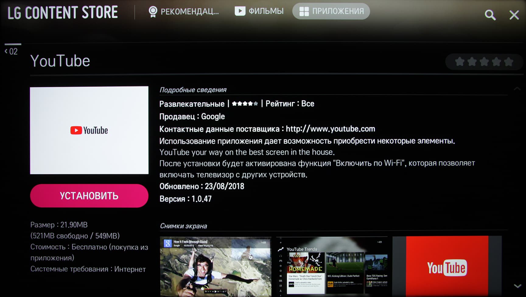 Приложение YouTube, кстати, изначально не предустановлено, вместо этого приложения в LG решили продвигать местных поставщиков потокового вещания и не очень актуальный для России Netflix.