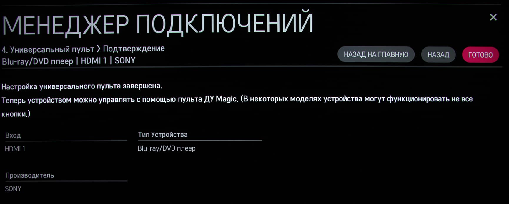 Для управления сторонней техникой используется ИК-излучатель пульта. Управлять ей приходится с помощью экранного меню, что не очень удобно, да и функций мало, например, нет команды выбора пункта в меню диска.