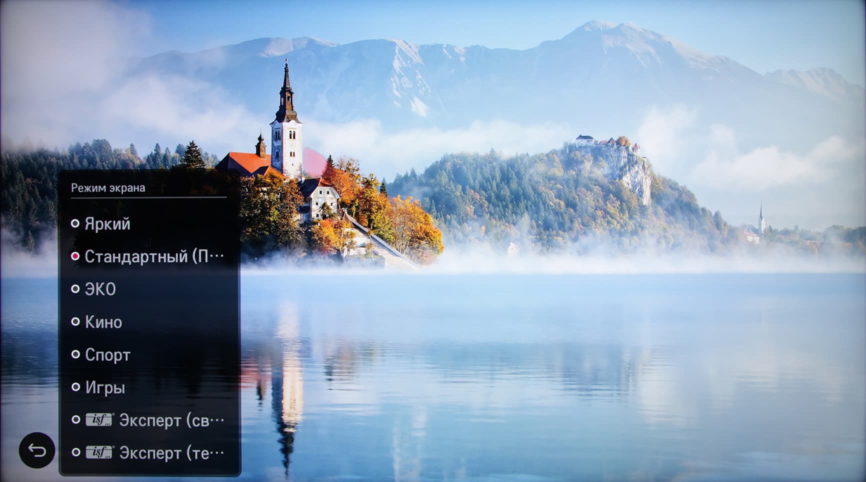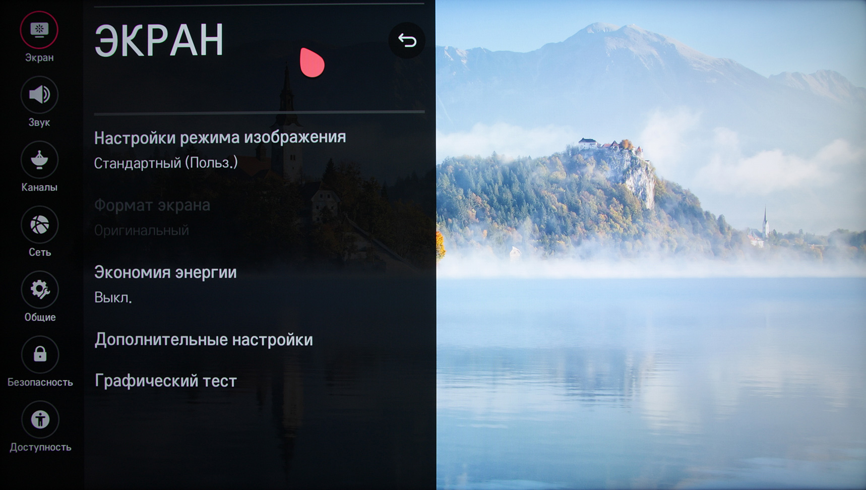 Меню с настройками ТВ занимает большую часть экрана, надписи в нем читаемые. Есть русифицированный вариант интерфейса. Качество перевода хорошее, и самое главное, что настройки в большинстве случаев меняют именно то, что ожидаешь, исходя из их наименования.