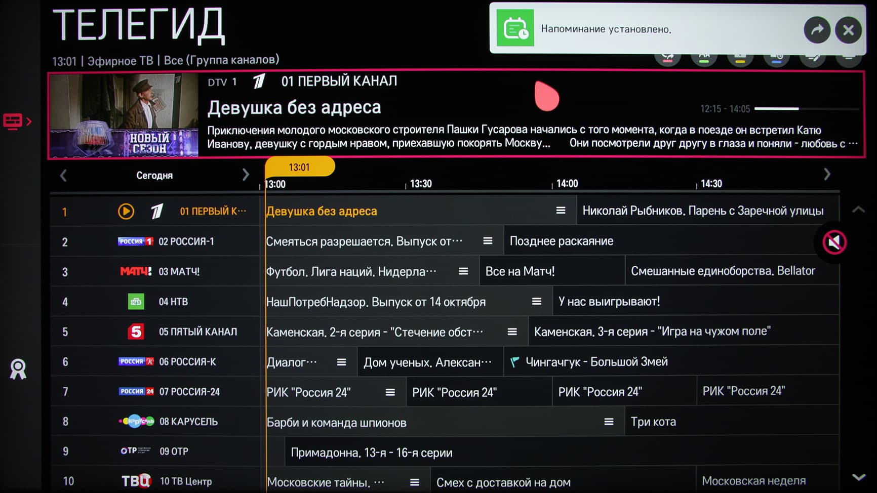 Есть хорошая поддержка электронной программы передач — можно посмотреть, что именно идет на текущем и других каналах и запрограммировать просмотр.