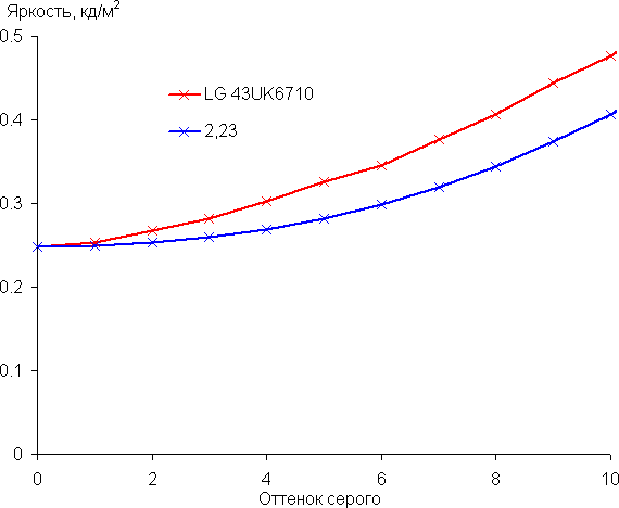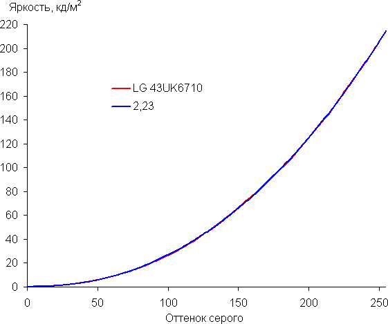 Аппроксимация полученной гамма-кривой дала показатель 2,23, что немного выше стандартного значения 2,2, при этом реальная гамма-кривая мало отклоняется от аппроксимирующей степенной функции: