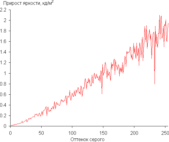 Для оценки характера роста яркости мы измерили яркость 256 оттенков серого (от 0, 0, 0 до 255, 255, 255) при подключении к ПК в режиме RGB. Параметр Гамма равен Средне,настройка Контрастность уменьшена до 90. График ниже показывает прирост (не абсолютное значение!) яркости между соседними полутонами: