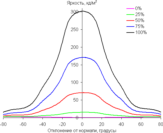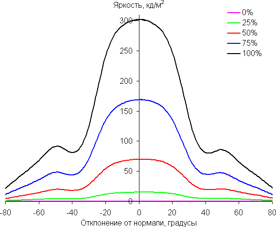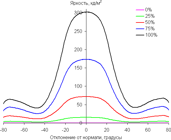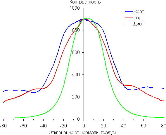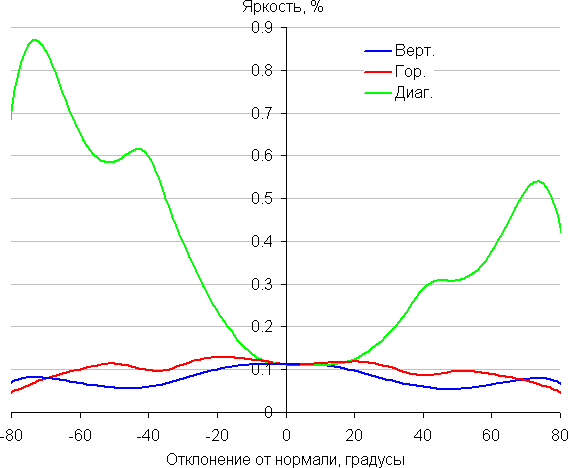 Отметим относительно плавное уменьшение яркости при отклонении от перпендикуляра к экрану во всех трех направлениях, при этом графики яркости полутонов не пересекаются во всем диапазоне измеряемых углов. При отклонении в диагональном направлении поведение яркости оттенков имеет промежуточный характер между вертикальным и горизонтальным направлениями, за исключением яркости черного поля, которая начинает резко возрастать уже при 20°-30° отклонения от перпендикуляра к экрану. Контрастность в диапазоне углов ±82° для двух направлений значительно превышает 10:1 и только для диагонального направления она ниже и по одной диагонали опускается за отметку 10:1 при 68°.
