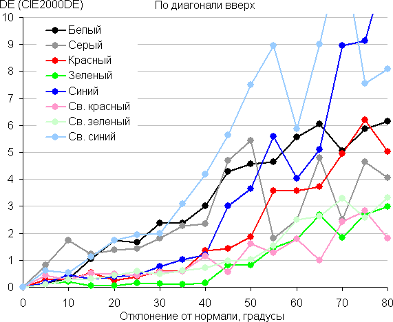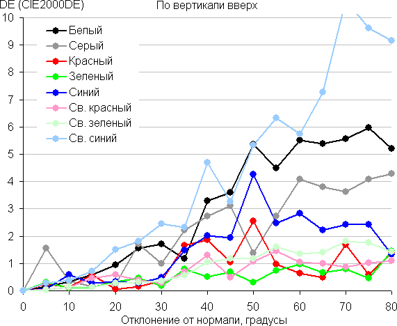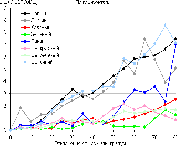 Для количественной характеристики изменения цветопередачи мы провели колориметрические измерения для белого, серого (127, 127, 127), красного, зеленого и синего, а также светло-красного, светло-зеленого и светло-синего полей во весь экран с использованием установки, подобной той, что применялась в предыдущем тесте. Измерения проводились в диапазоне углов от 0° (датчик направлен перпендикулярно к экрану) до 80° с шагом в 5°. Полученные значения интенсивностей были пересчитаны в отклонение ΔE относительно замера каждого поля при перпендикулярном положении датчика относительно экрана. Результаты представлены ниже: