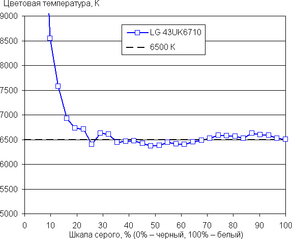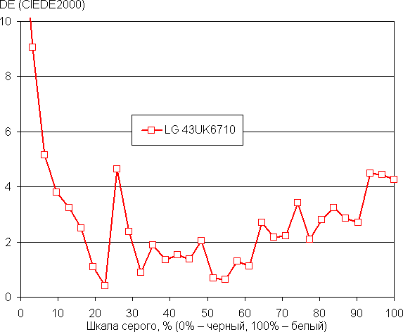 Самый близкий к черному диапазон можно не учитывать, так как в нем цветопередача не так важна, а погрешность измерения цветовых характеристик высокая. С потребительской точки зрения баланс очень хороший, так как на большей части шкалы серого цветовая температура близка к стандартным 6500 К, а ΔE ниже 10 единиц, при этом оба параметра мало изменяются от оттенка к оттенку.