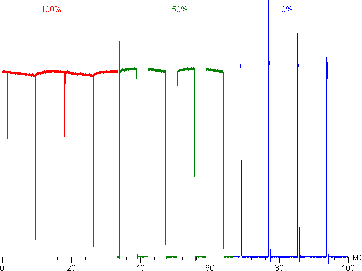 Частота модуляции относительно невысокая, поэтому на средней и низкой яркости при быстром движении глаз или в тесте на стробоскопический эффект может быть выявлено мерцание изображения.
