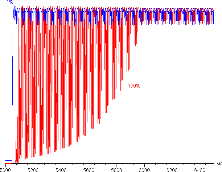 При включенном режиме с динамическим управлением яркости установившаяся контрастность формально возрастает до бесконечности, так как на черном поле во весь экран подсветка выключается совсем. График ниже показывает, как увеличивается яркость (вертикальная ось) при переключении с черного поля (после пяти секунд вывода) на белое для размера черного поля 1% от площади экрана (нет динамической подстройки яркости) и 100% (зависимости не сглажены):