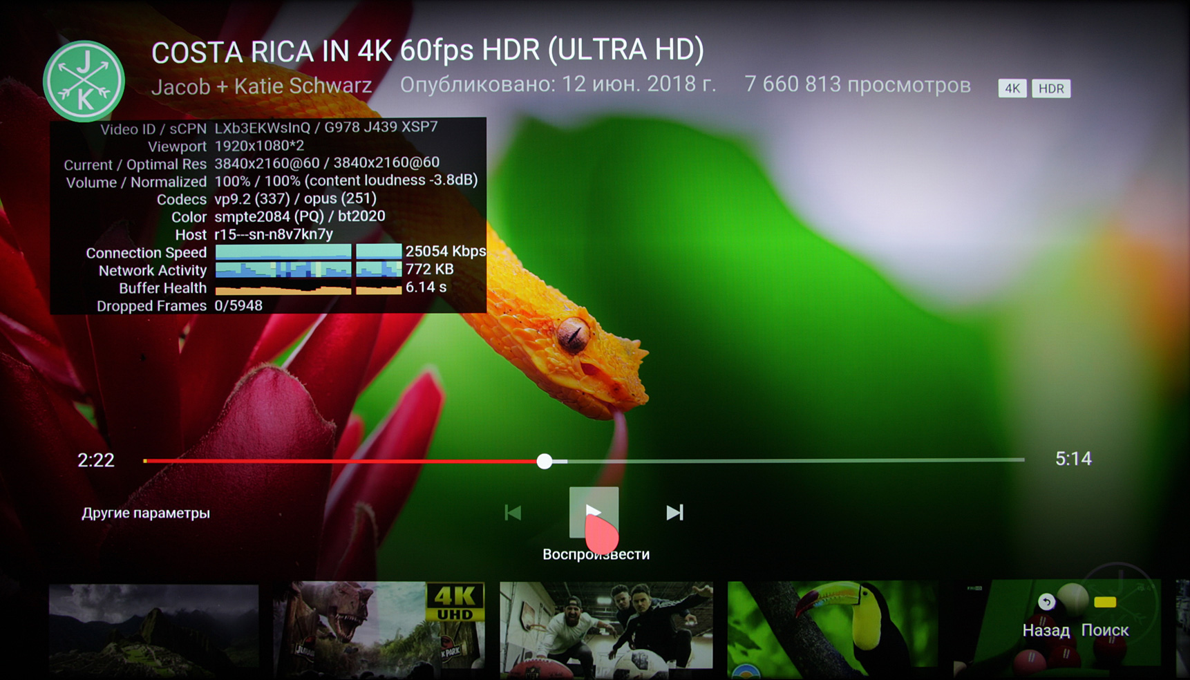 Редко, но попадались видеофайлы, с которыми у телевизора были проблемы. Например, DivX 3 в AVI не воспроизводились, а MPEG1 VCD и MPEG2 SVCD / KVCD неправильно увеличивались до размера экрана. В стандартном для видео диапазоне (16—235) отображаются все градации оттенков. Тестовые ролики на определение равномерности чередования кадров помогли выявить, что телевизор при воспроизведении видеофайлов подстраивает частоту обновления экрана под частоту кадров в видеофайле, поэтому, например, кадры файлов с 24, 25, 30, 50 и 60 кадр/с выводятся с одинаковой длительностью. Максимальный битрейт видеофайлов, при котором еще не было артефактов, при воспроизведении с USB-носителей и по Wi-Fi (5 ГГц) составил как минимум 120 Мбит/с (не было тестовых файлов с большим битрейтом), а по проводной сети Ethernet — как минимум 90 Мбит/с (файл с битрейтом 120 Мбит/с уже подтормаживал). В двух последних случаях использовался медиасервер роутера Asus RT-AC68U. Статистика на роутере показывает, что скорость приема и передачи составляет 866,7 Мбит/с, то есть в телевизоре действительно установлен адаптер 802.11ac. Кстати, в приложении YouTube удалось посмотреть видео в разрешении 4K с HDR и даже с 60 кадр/с.