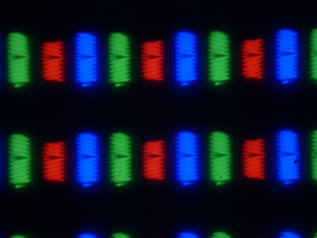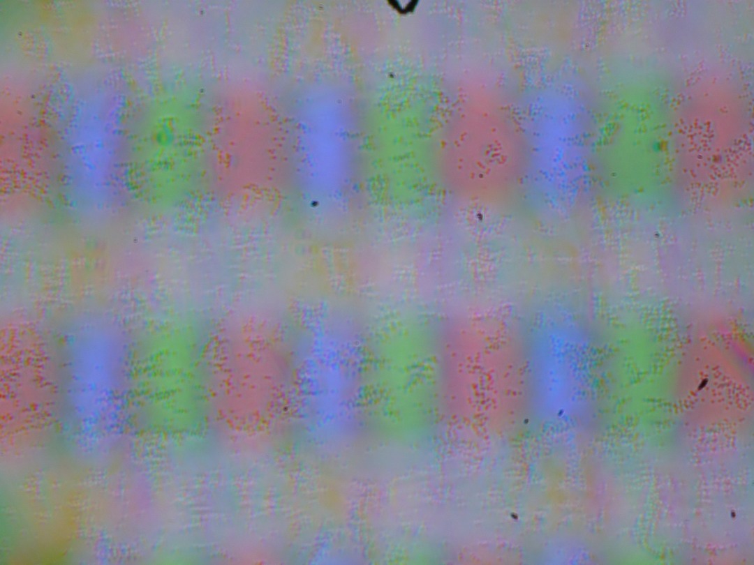 Согласно паспортным характеристикам, в данном телевизоре установлена матрица типа IPS. Микрофотографии не противоречат этому (черные точки — это пыль на матрице фотоаппарата):