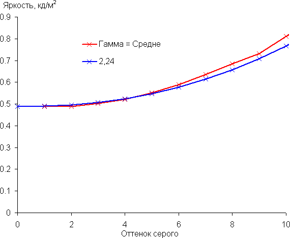 В среднем рост прироста яркости более-менее равномерный, и почти каждый следующий оттенок ярче предыдущего. В самой темной области первые два оттенка серого не отличаются по яркости от черного цвета: