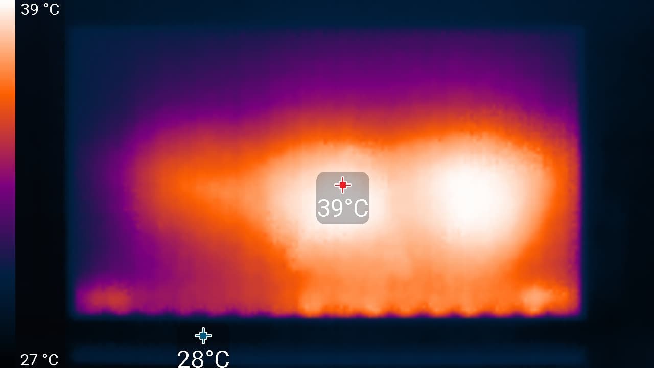 Нагрев умеренный и он закономерно выше в центре, так как там сзади утолщение корпуса с электроникой и пластиковым кожухом, а сама панель греется равномерно, но по краям охлаждается лучше.
