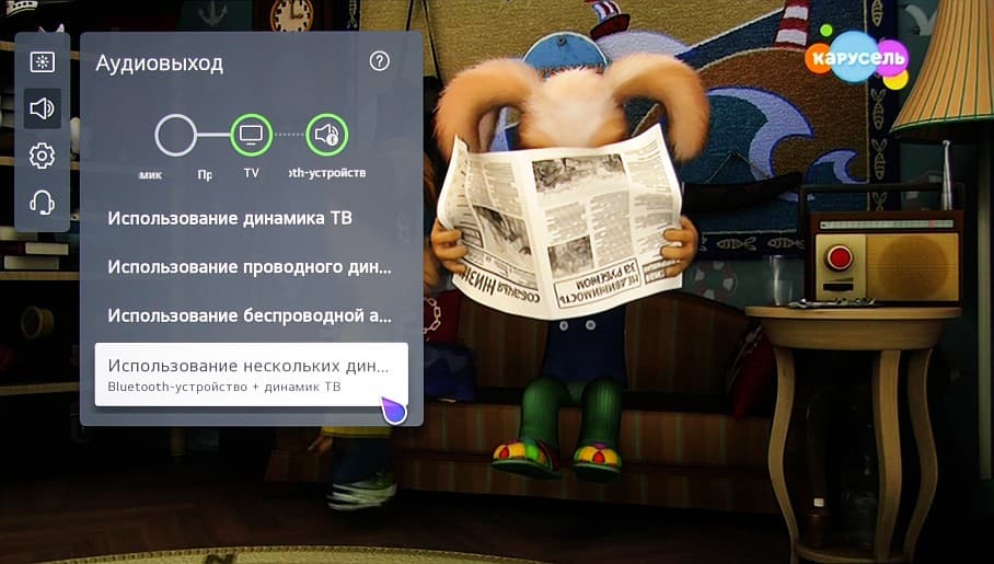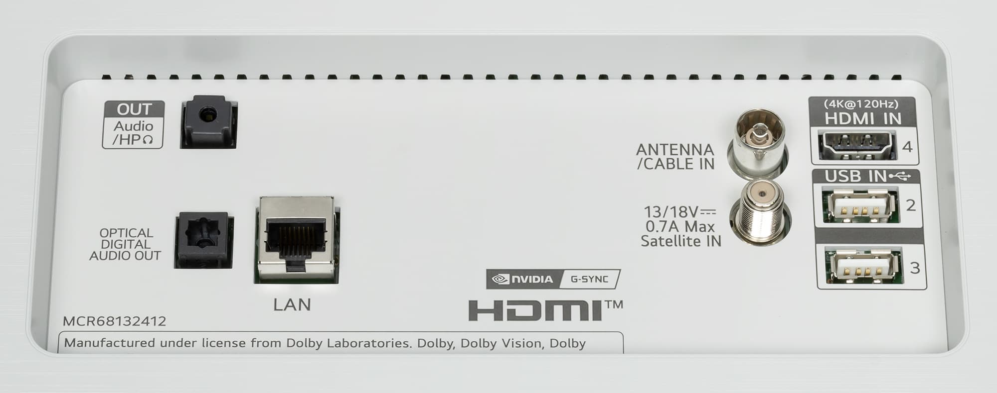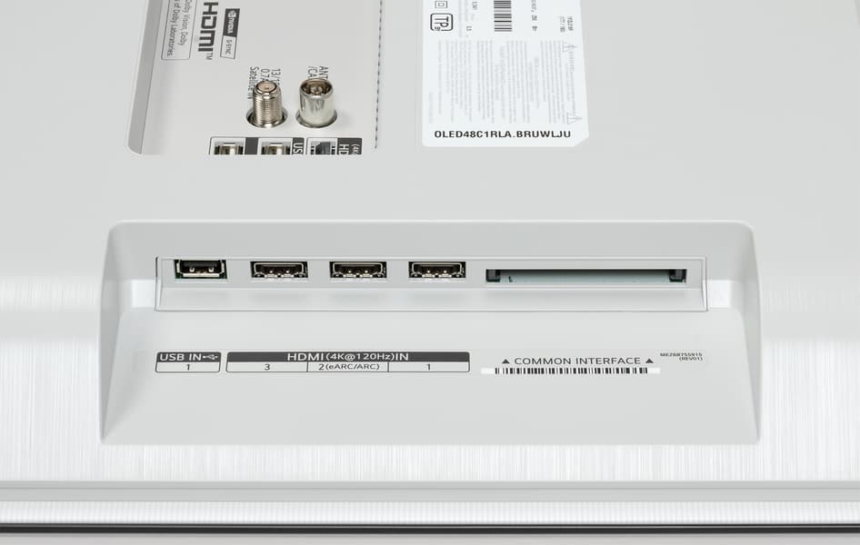Все разъемы стандартные, полноразмерные и размещены свободно. В плюсы стоит записать целых 4 входа HDMI и три USB. Все входы HDMI имеют версию 2.1, и, в частности, поддерживают игровые функции VRR (переменная частота обновления) и ALLM (автоматическое включение режима с низкой задержкой вывода), а также видеосигнал с разрешением 4К при 120 Гц. Пользователь может использовать наушники с интерфейсом Bluetooth. Для проверки мы успешно подключились к нашей тестовой беспроводной колонке Sven PS-200BL. В настройках можно выбирать предпочитаемый способ вывода звука, в том числе режим одновременного вывода как на встроенные громкоговорители, так и на наушники.