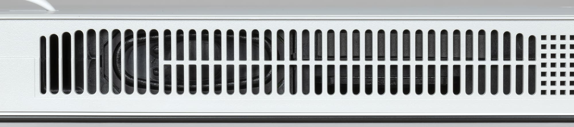 На верхнем и на нижнем торцах и на вертикальной плоскости примерно посередине выступающего сзади блока есть вентиляционные решетки. За нижней решеткой расположены громкоговорители — можно увидеть две пары из средне-высокочастотного громкоговорителя с вытянутым диффузором и порта низкочастотного громкоговорителя.