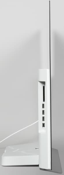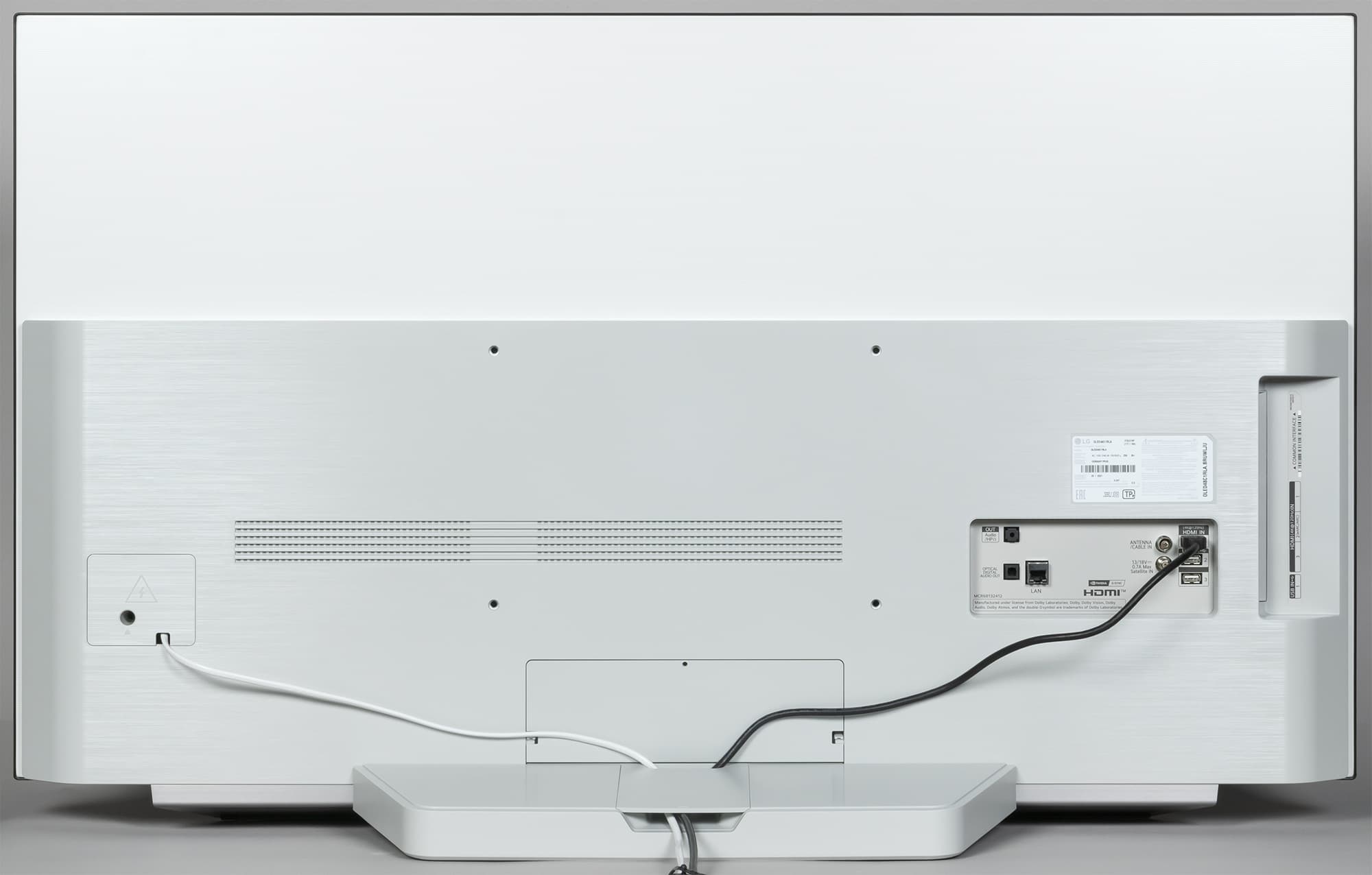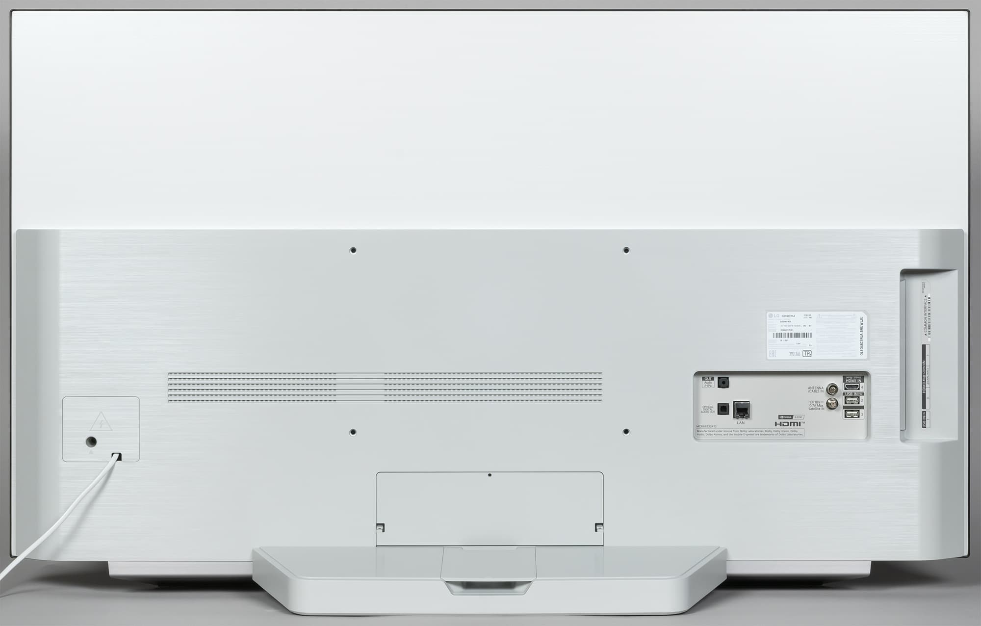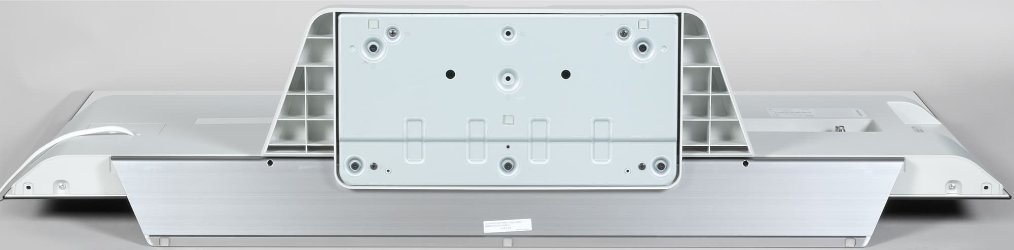 Однако выступающий блок снизу сзади увеличивает максимальную толщину блока экрана до 46,9 мм (по данным производителя). Это утолщение позволяет разместить в нем всю управляющую и силовую электронику, разъемы, громкоговорители и дополнительные элементы жесткости, в том числе для крепления подставки. Кожух утолщения сзади, задняя часть подставки и декоративные щитки изготовлены из пластика со светло-светло-серой матовой поверхностью местами с фактурой. Задняя панель в тонкой части имеет едва определяемый рельеф в виде горизонтальных полосок и стойкое белое покрытий со светло-серыми горизонтальными полосками. Сзади телевизор выглядит аккуратно.
