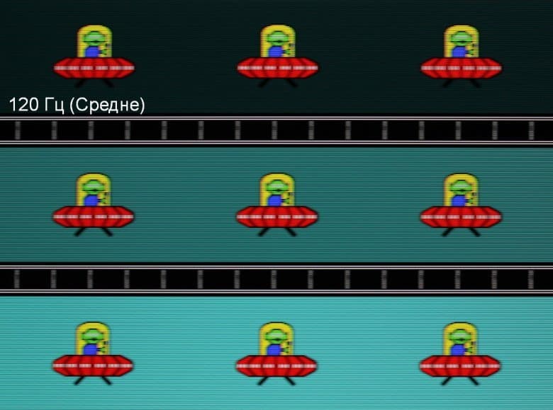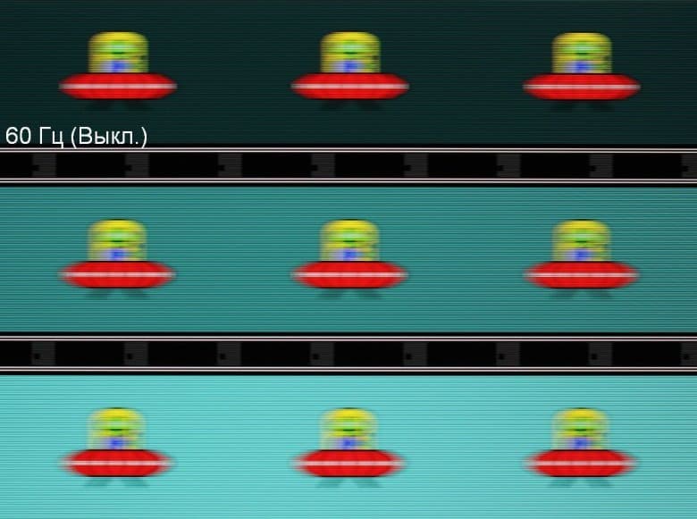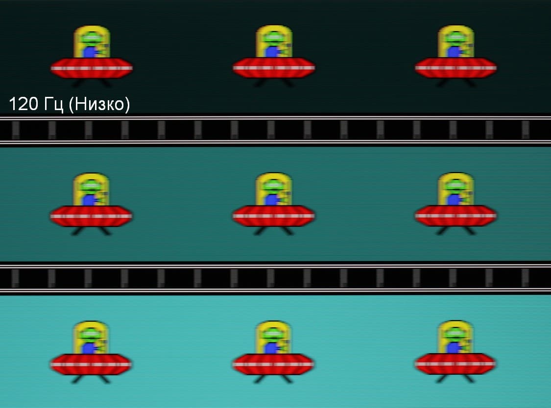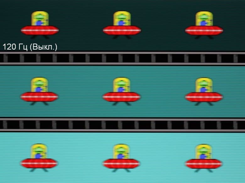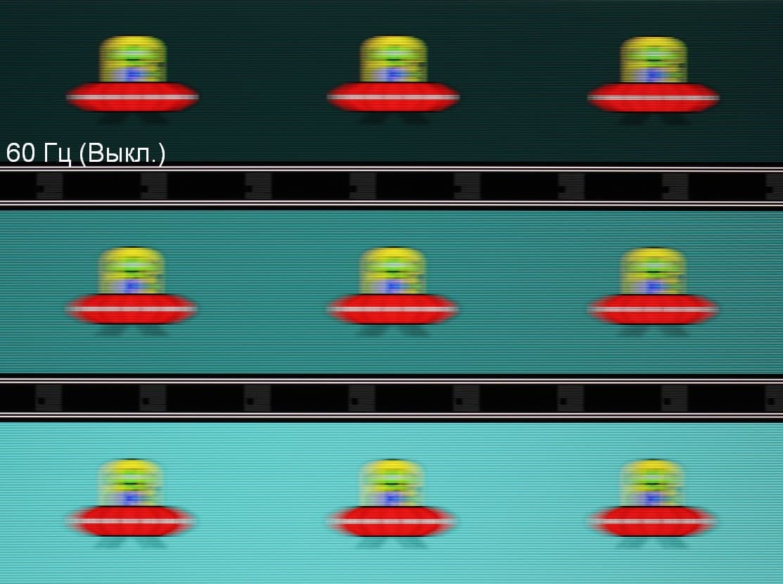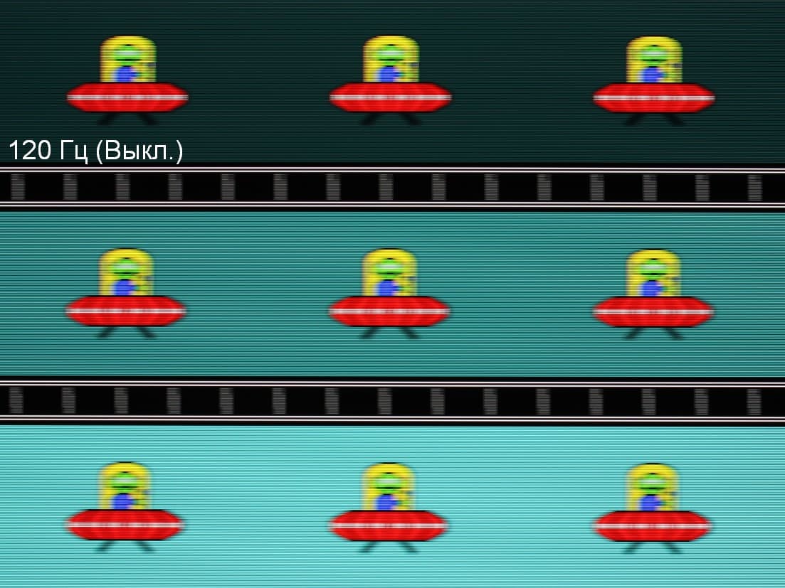 Видно, что при прочих равных условиях четкость изображения повышается по мере роста частоты обновления, а включение функции OLED Motion Pro существенно повышает четкость, не приводя к появлению артефактов.