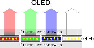 В матрице OLED каждый субпиксель представляет собой независимо управляемый источник света. В данном случае для снижения энергозатрат и повышения яркости каждая триада красного, зеленого и синего субпикселя дополнена белым субпикселем, то есть пиксель состоит из четырех субпикселей.