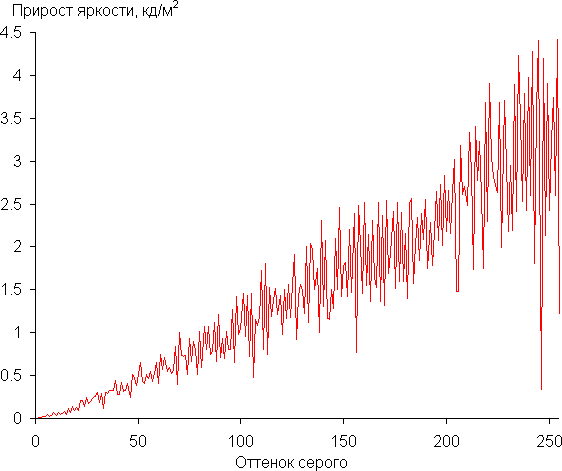 Для оценки характера роста яркости мы измерили яркость 256 оттенков серого (от 0, 0, 0 до 255, 255, 255) при выборе профиля Стандартный. График ниже показывает прирост (не абсолютное значение!) яркости между соседними полутонами: