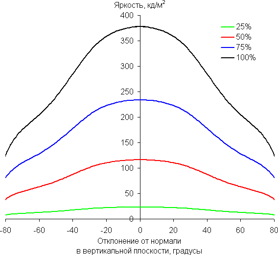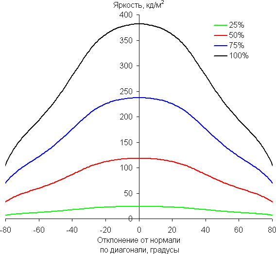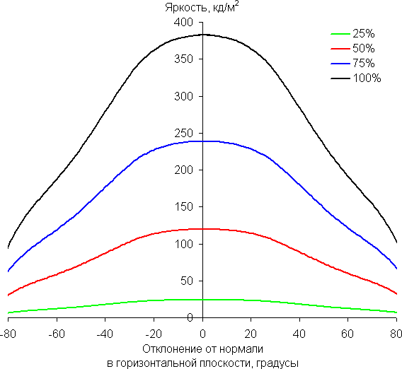 Отметим очень плавное уменьшение яркости при отклонении от перпендикуляра к экрану во всех трех направлениях, при этом графики яркости полутонов не пересекаются во всем диапазоне измеряемых углов. Для сравнения: в случае типичного ЖК-телевизора на матрице VA яркость падает вдвое уже примерно при 30°.