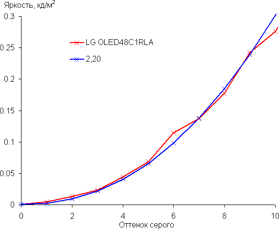 Аппроксимация полученной гамма-кривой дала показатель 2,20, что равно стандартному значению 2,2, при этом реальная гамма-кривая мало отклоняется от аппроксимирующей степенной функции: