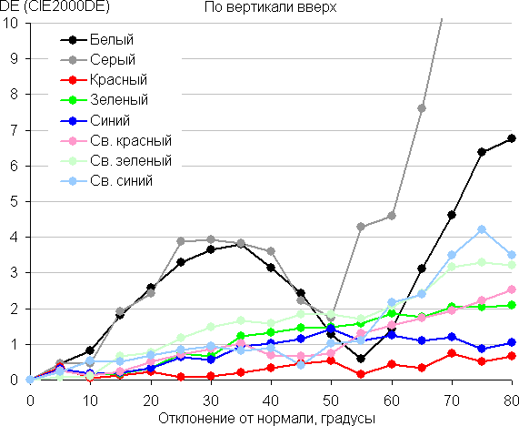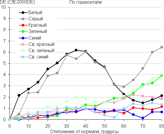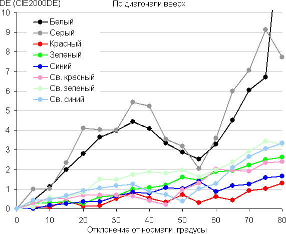 Для количественной характеристики изменения цветопередачи мы провели колориметрические измерения для белого, серого (127, 127, 127), красного, зеленого и синего, а также светло-красного, светло-зеленого и светло-синего полей во весь экран с использованием установки, подобной той, что применялась в предыдущем тесте. Измерения проводились в диапазоне углов от 0° (датчик направлен перпендикулярно к экрану) до 80° с шагом в 5°. Полученные значения интенсивностей были пересчитаны в отклонение ΔE относительно замера каждого поля при перпендикулярном положении датчика относительно экрана. Результаты представлены ниже: