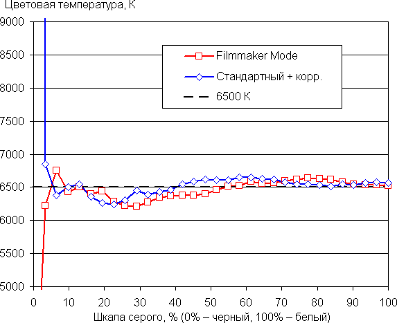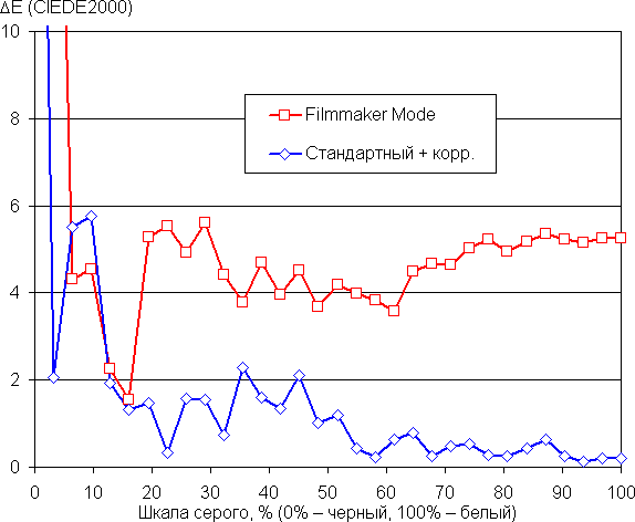 Графики ниже показывают цветовую температуру на различных участках шкалы серого и отклонение от спектра абсолютно черного тела (параметр ΔE) для профиля Filmmaker Mode, в котором, судя по названию, цветопередача должна быть самой правильной, и для профиля Стандартный после ручной подстройки цветового баланса выбором значения 46 для настройки Цвет. темп-ра и 0, −10 и −5 для настроек усиления трех основных цветов: