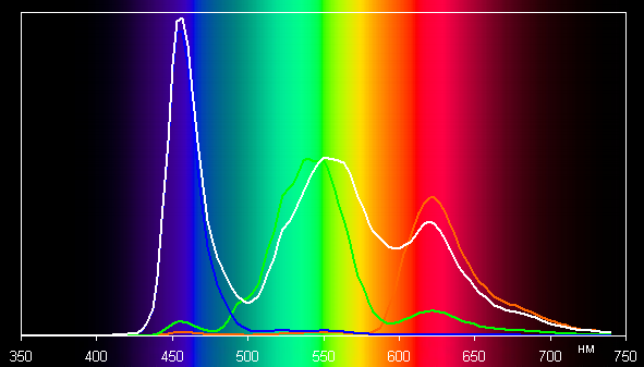 Ниже приведен спектр для белого поля (белая линия), наложенный на спектры красного, зеленого и синего полей (линии соответствующих цветов) для профиля Собственный: