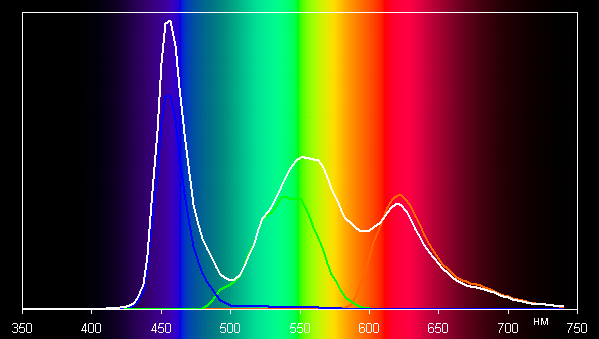 Участие белого субпикселя проявляется в частности в том, что спектр белого явно не является простой суммой спектров красного, зеленого и синего цветов. Отметим, что белый субпиксель позволяет легко смещать баланс яркости белых участков относительно цветных. Тем не менее, визуально дисбаланса яркости не наблюдается.