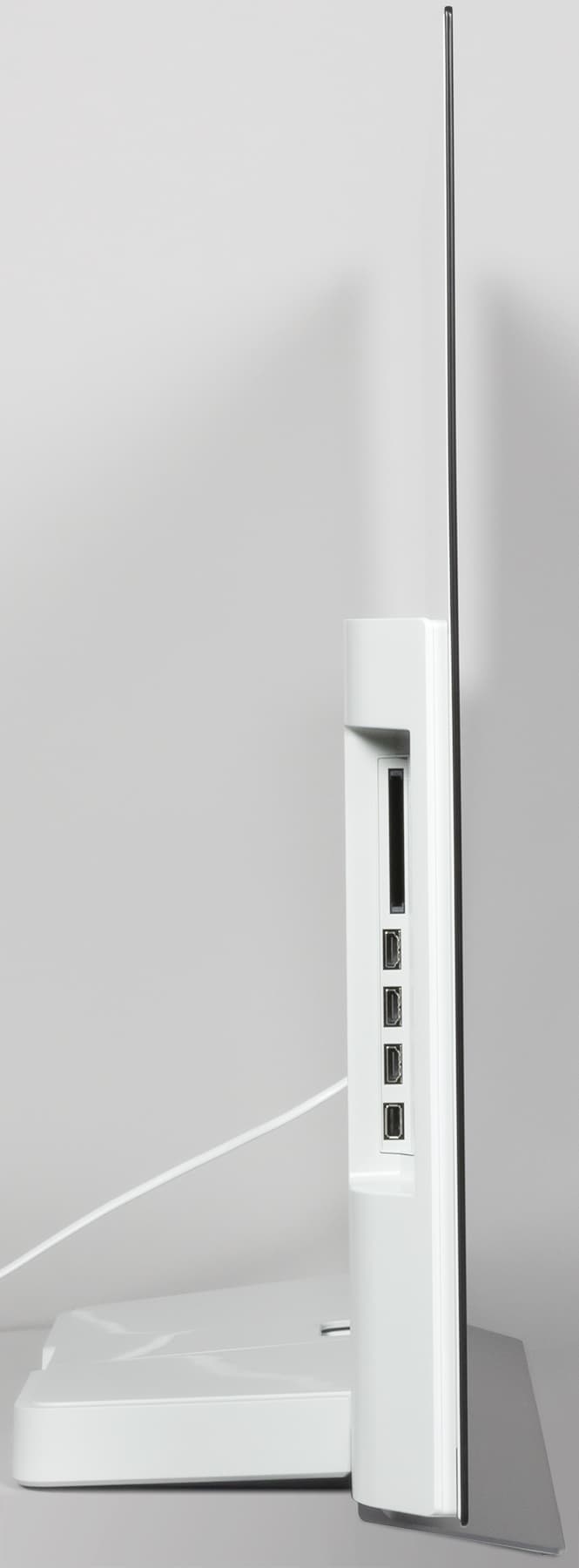 Особенностью дизайна является центральная подставка с эффектом подвешенного экрана, который как бы парит невысоко над столом. Матрицу OLED защищает фронтальная пластина из минерального стекла с зеркально-гладкой поверхностью. Эффективный антибликовый фильтр снижает яркость отраженных объектов до такой степени, что зеркальность экрана в большинстве случаев просмотру не мешает. Но отражение ярких источников света в экране все же видно. Следы от пальцев не очень сильно снижают антибликовые свойства и удаляются относительно легко.