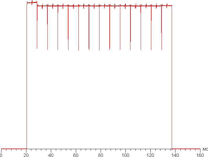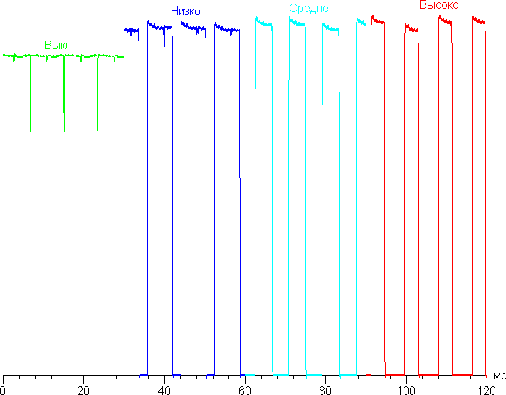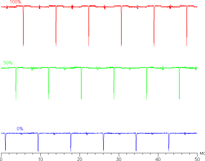 На любом уровне яркости видимое мерцание отсутствует, его не выявляет и тест на стробоскопический эффект. Регистрация зависимости яркости от времени при различных уровнях яркости выявила модуляцию яркости с очень высоким коэффициентом заполнения, что и объясняет отсутствие мерцания. В доказательство приведем графики зависимости яркости (вертикальная ось) от времени (горизонтальная ось) при различных значениях настройки Яркость пикселей OLED в случае белого поля примерно на 20% от площади экрана: