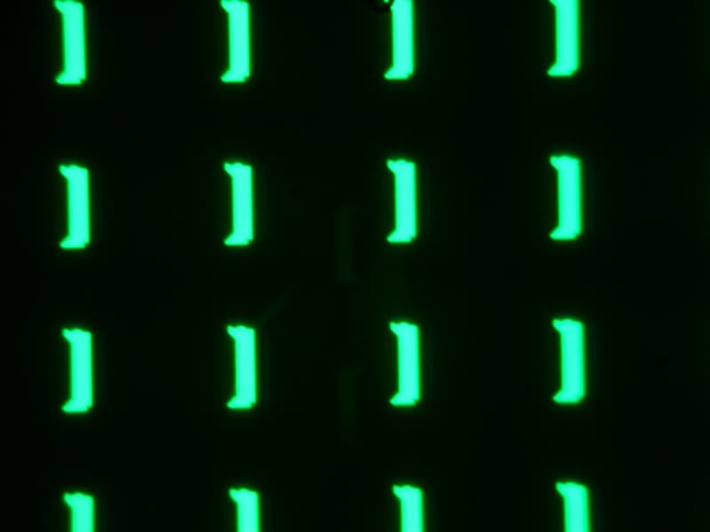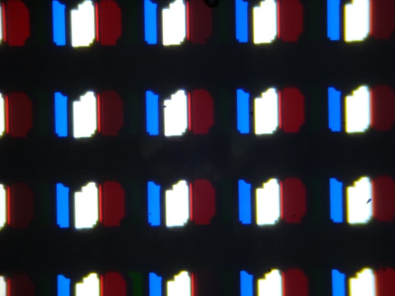Видно, что светофильтры нанесены вертикальными полосками, как и в случае типичной ЖК-матрицы. При этом белый цвет формируется без участия зеленого субпикселя, так как достаточно свечения белого субпикселя, оттенок которого слегка корректируется добавлением света от красного и синего субпикселя.