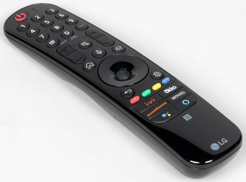 К телевизору прилагается пульт серии Magic (модель MR21N). Верхняя часть корпуса пульта и крышка отсека элементов питания изготовлены из черного пластика, а нижняя — из прозрачного, но плотно тонированного пластика, прозрачного для ИК. Благодаря особой форме пульт удобно лежит в руке. Весит пульт с элементами питания вместе 144 г. Обозначения большинства кнопок достаточно крупные и контрастные. Кнопок не очень много, но и не мало, почти оптимальное количество. В наличии и кнопки быстрого запуска нескольких предустановленных приложений, но случайно они не нажимаются, что уже хорошо. Часть функций выбирается при длительном удерживании кнопок. При нажатии на кнопки красным подсвечивается кнопка питания. Есть прокрутка списков и т. д. с помощью удобного колесика, а нажатие на колесико соответствует команде выбора. В передней части пульта расположено отверстие микрофона. Нажатие на кнопку с изображением микрофона приглушает звук телевизора и переводит его в состояние ожидания голосовой команды. О каких-то воспринимаемых телевизором командах можно догадаться, что-то можно подсмотреть во встроенной справке.