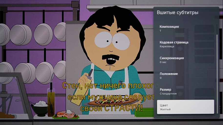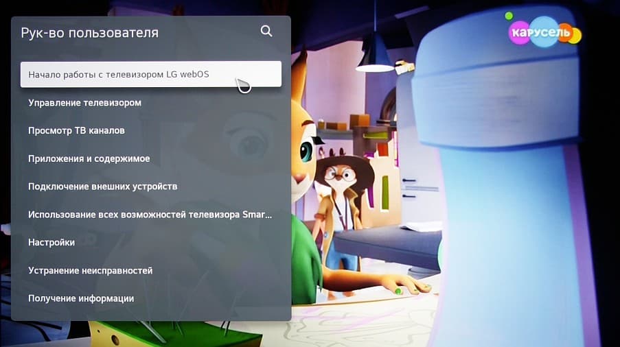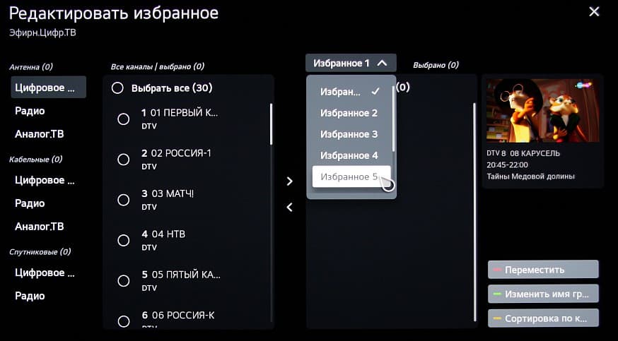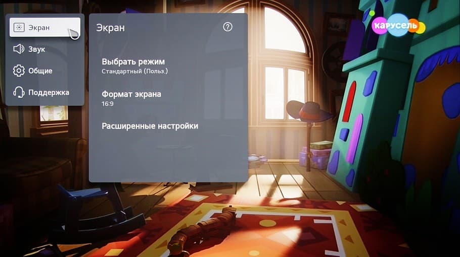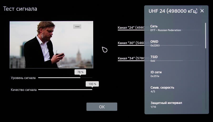 Меню с настройками ТВ занимает большую часть экрана, надписи в нем читаемые. Есть русифицированный вариант интерфейса. Качество перевода хорошее.