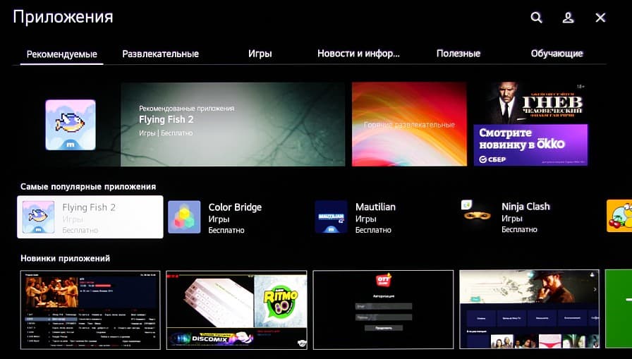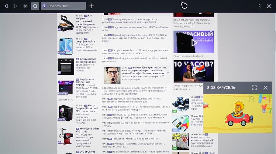 Приложений в магазине относительно много. Конечно, все доступные приложения для webOS Smart TV по количеству и функциональности нельзя даже и пытаться сравнивать с разнообразием приложений для Android [TV]. Встроенный браузер по интернету хорошо справился с показом главной страницы iXBT.com и содержимого статей, но страницы отрисовываются в разрешении 1920×1080. Интересная функция браузера — отображение в левой половине экрана видео от текущего источника. При этом пользователь может быстро переключиться на полноэкранный вывод видео или загнать его в небольшое окошко, которое можно переместить в нужное место на экране.