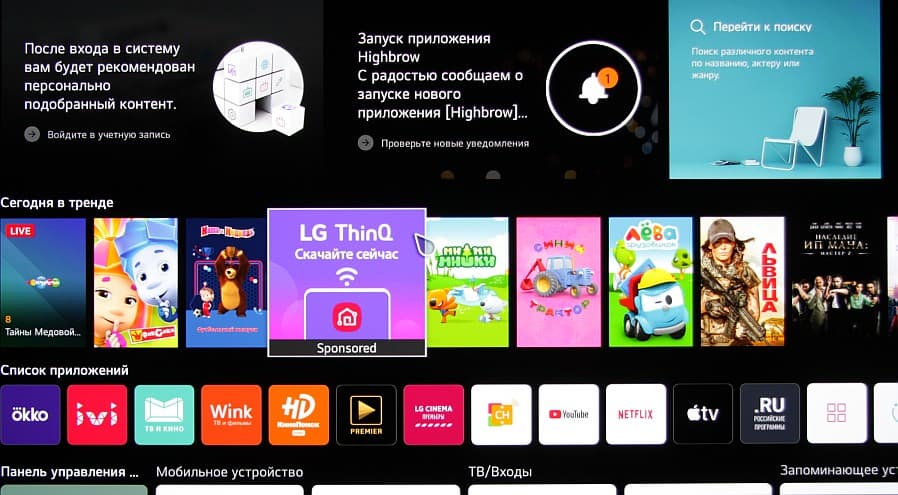 Из приложения можно включить телевизор, находящийся в режиме ожидания. Отметим, что производитель активно переводит пользователей с LG TV Plus на приложение умного дома LG ThinQ. Это приложение установлено и на самом телевизоре: