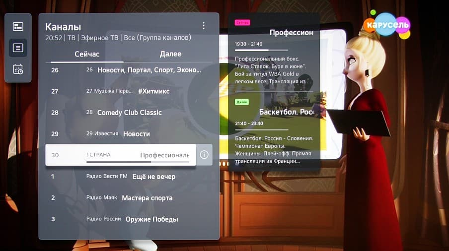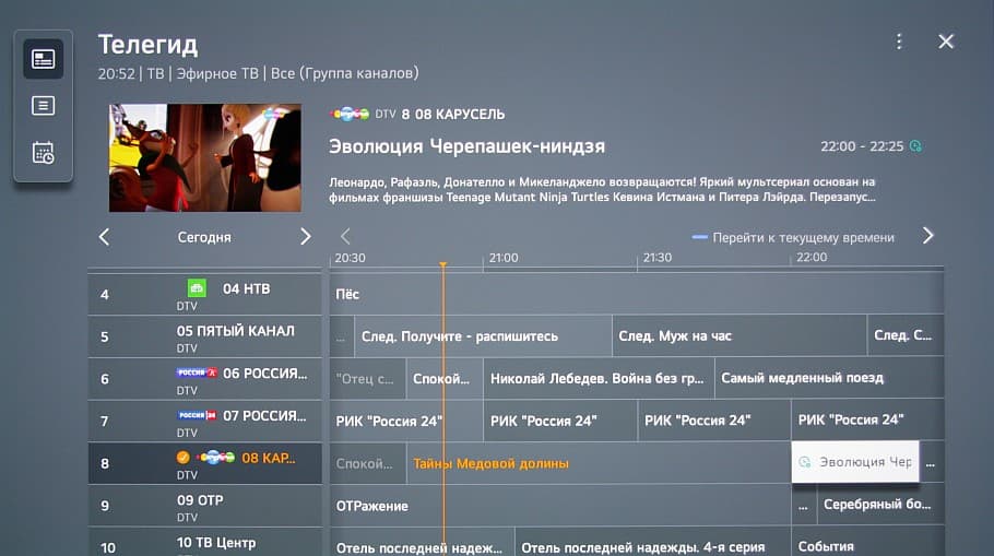 Есть хорошая поддержка электронной программы передач (если она передается) — можно посмотреть, что именно идет на текущем и других каналах и запрограммировать просмотр программы или сериала.