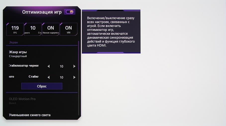 Есть функция OLED Motion Pro, повышающая четкость объектов в движении, которую можно включить в игровом режиме. Достигается это за счет вставки черного кадра. В зависимости от значения одноименной настройки меняется длительность черного кадра: